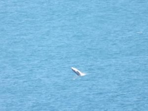 Estava junto com sua mãe e com uma baleia “escorte”- nome dado a uma terceira baleia que acompanha a dupla de mãe e filhote. Não se sabe exatamente a função desse escorte, normalmente são machos que podem estar esperando a fêmea entrar em ovulação pós-parto.