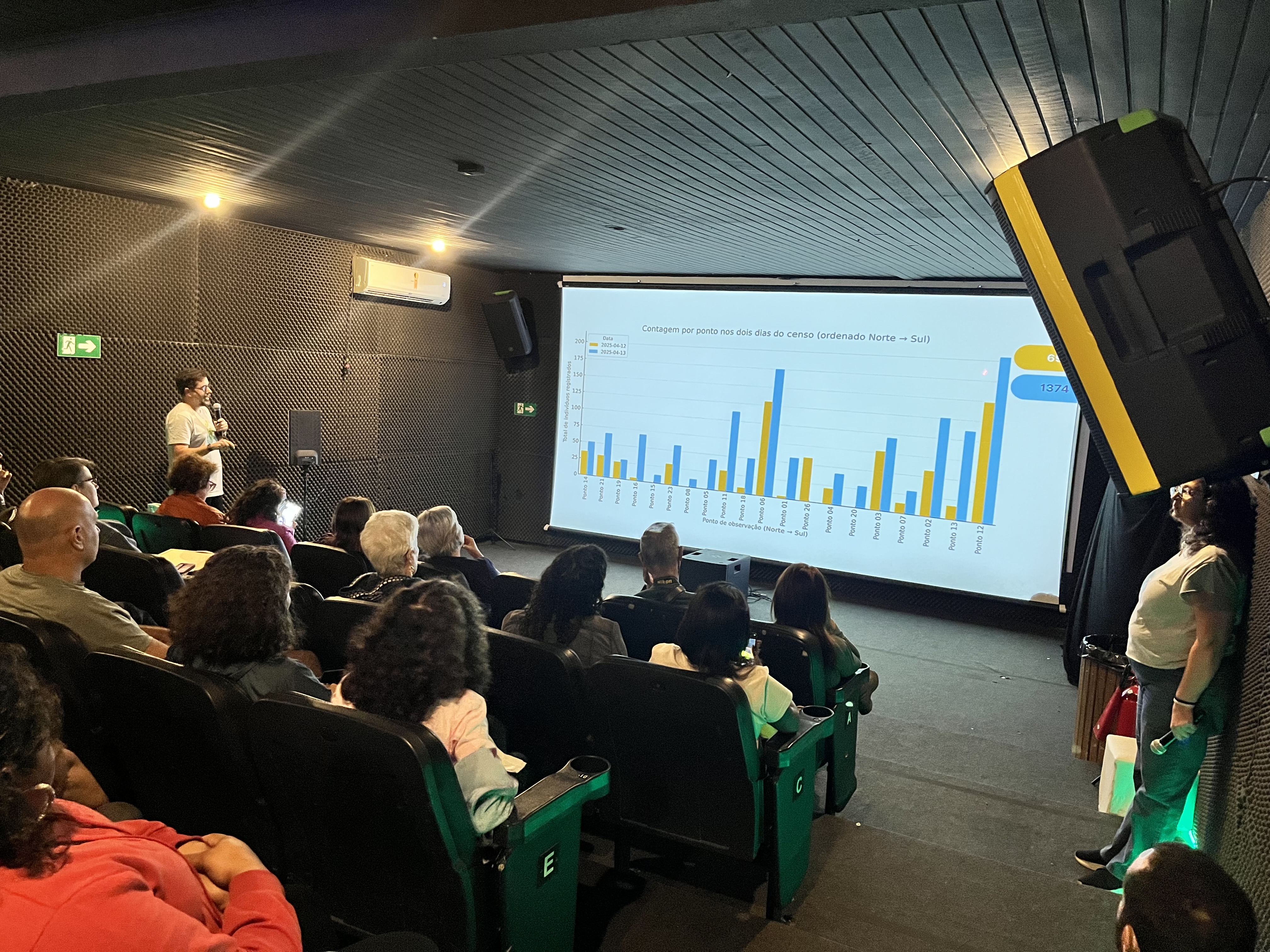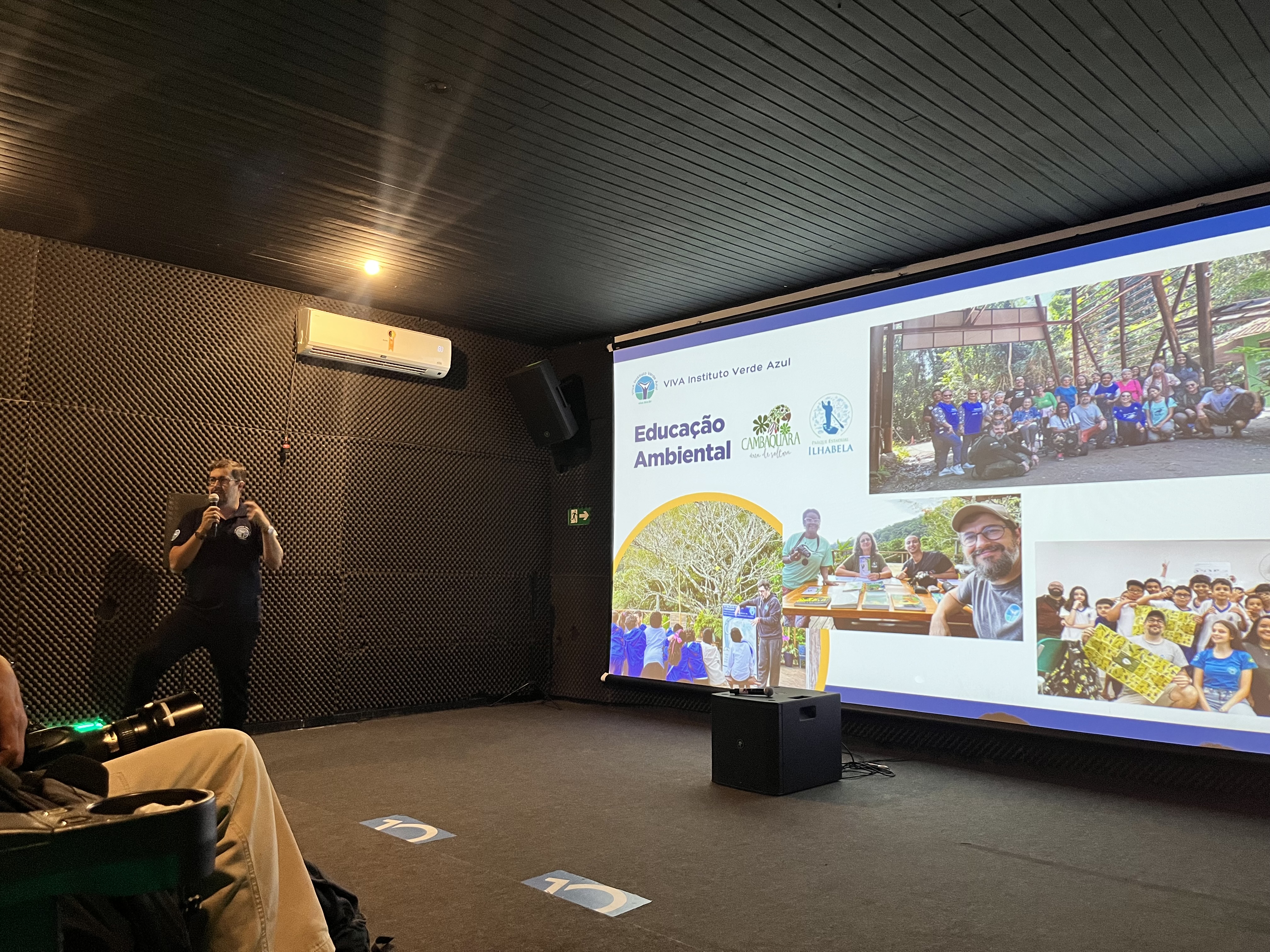 Para encerrar a participação, o coordenador do VIVAves, Dr. Marcio Motta, apresentou o projeto no painel sobre a Natureza de Ilhabela, destacando as ações de pesquisa e educação já realizadas. No mesmo espaço, participou ainda como co-apresentador ao lado da bióloga Silvana Davino, da Área de Soltura Cambaquara, falando sobre a contagem coletiva dos papagaios-moleiros (Amazona farinosa) iniciada em 2024. A partir deste ano, a sede do VIVA passa a ser também um ponto oficial de monitoramento periódico da espécie.