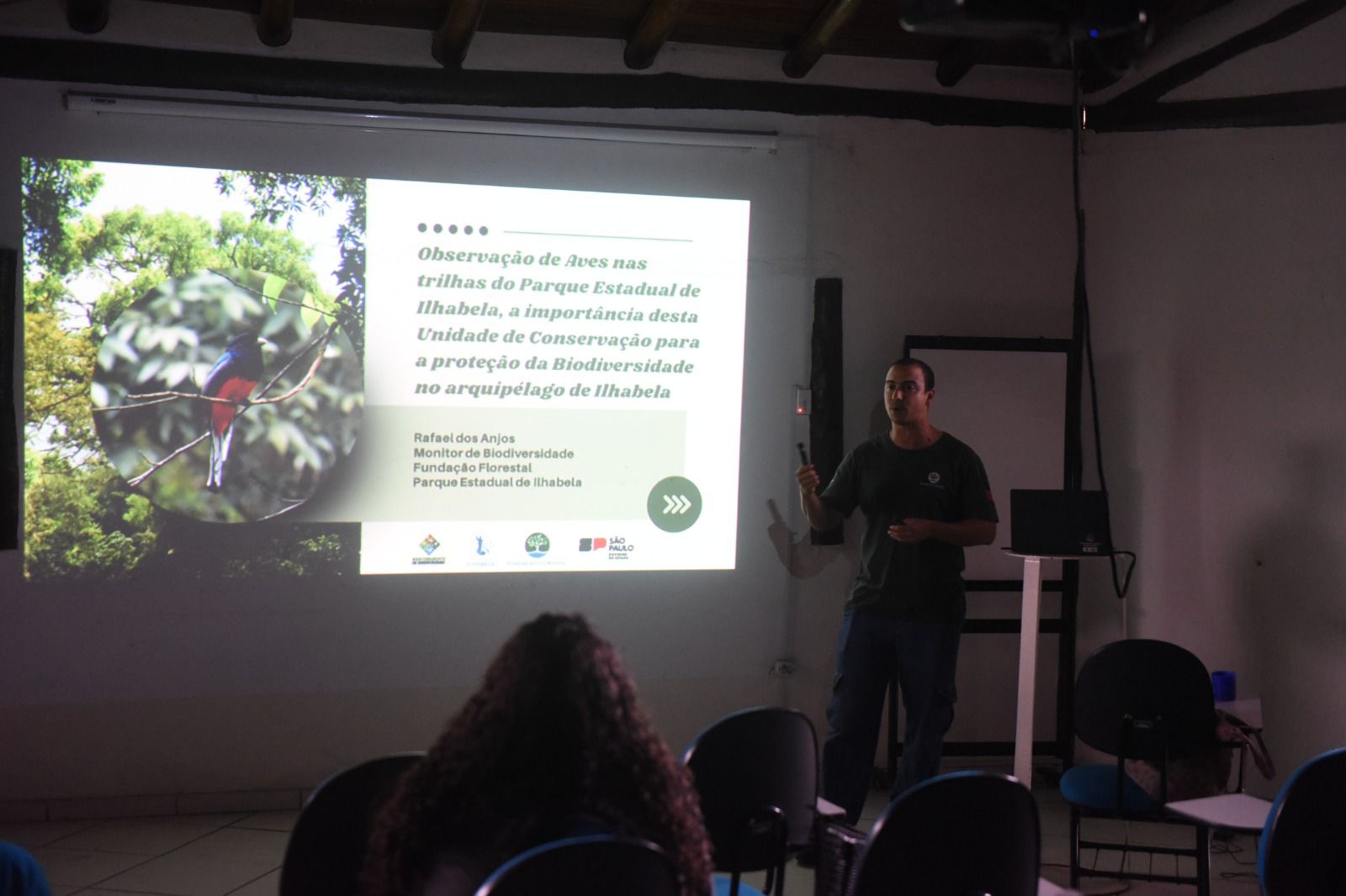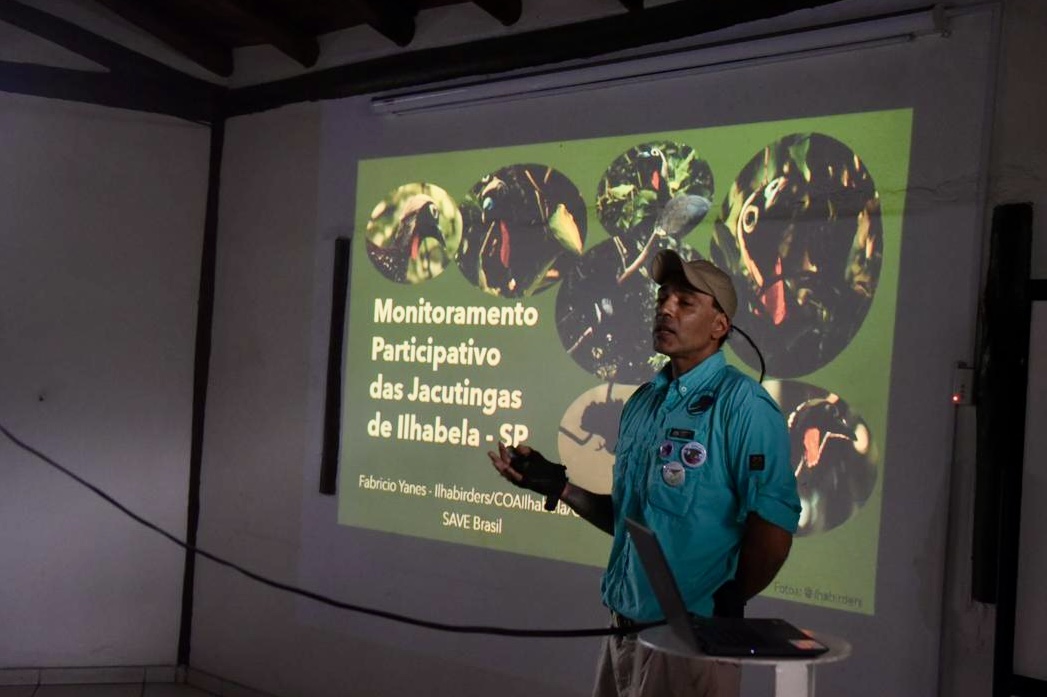 The program also included, in the morning, a birdwatching walk along the Estrada Parque with guides Nelson Santanna and Fabrício Yanes, followed by a shared breakfast at Sítio Ciribai Caiçara, as well as talks by Fabrício Yanes on the participatory monitoring of the Black-fronted Piping Guan (Jacutinga) and by Rafael dos Anjos Costa, Environmental Monitor of the Ilhabela State Park (PEIb), about birdwatching along the park’s trails and its implications for conservation.